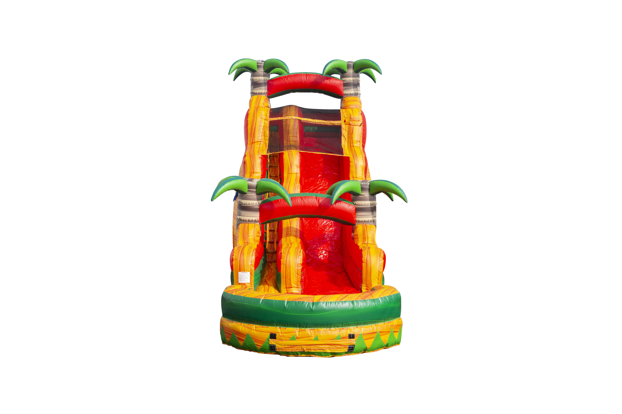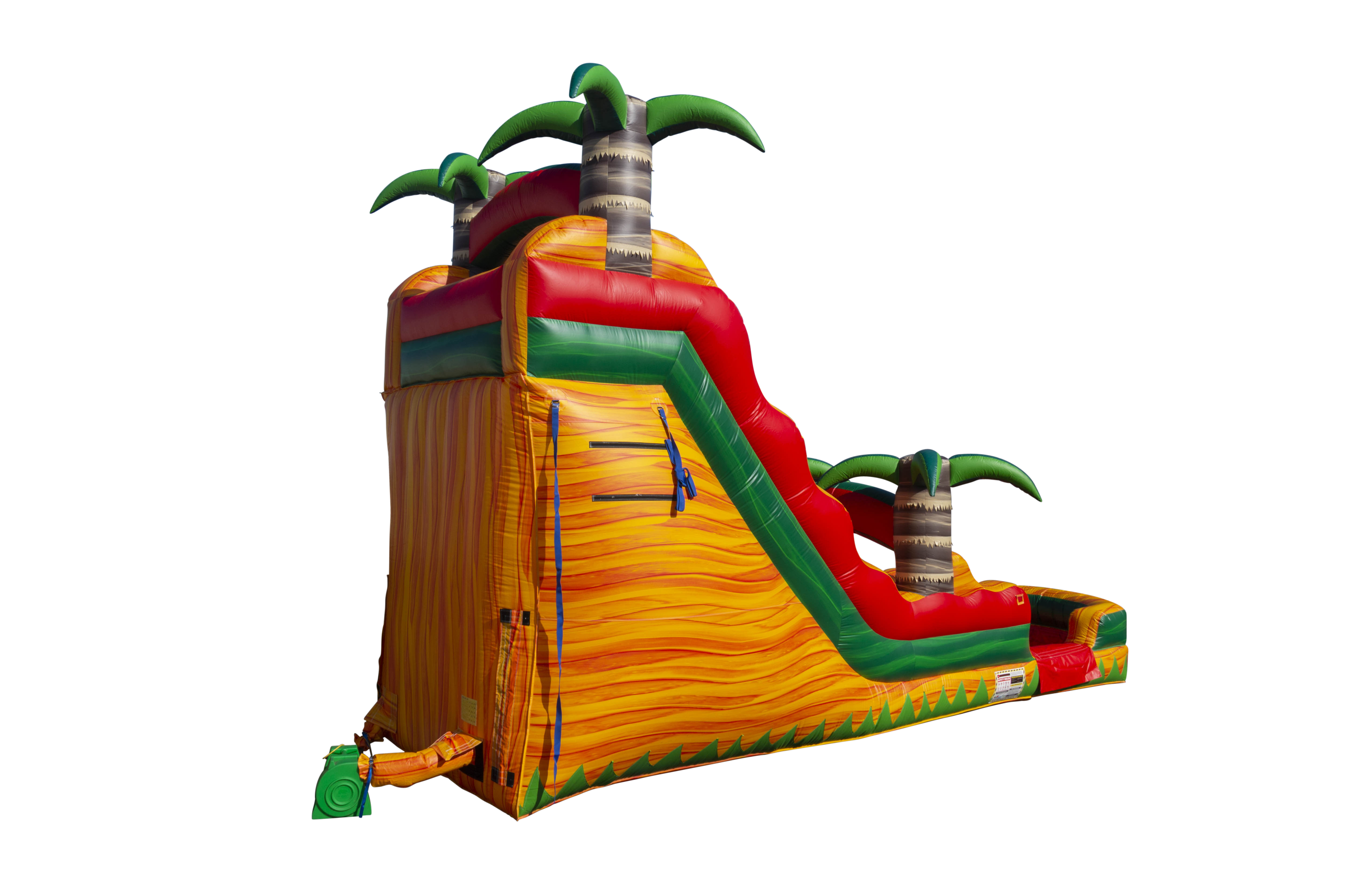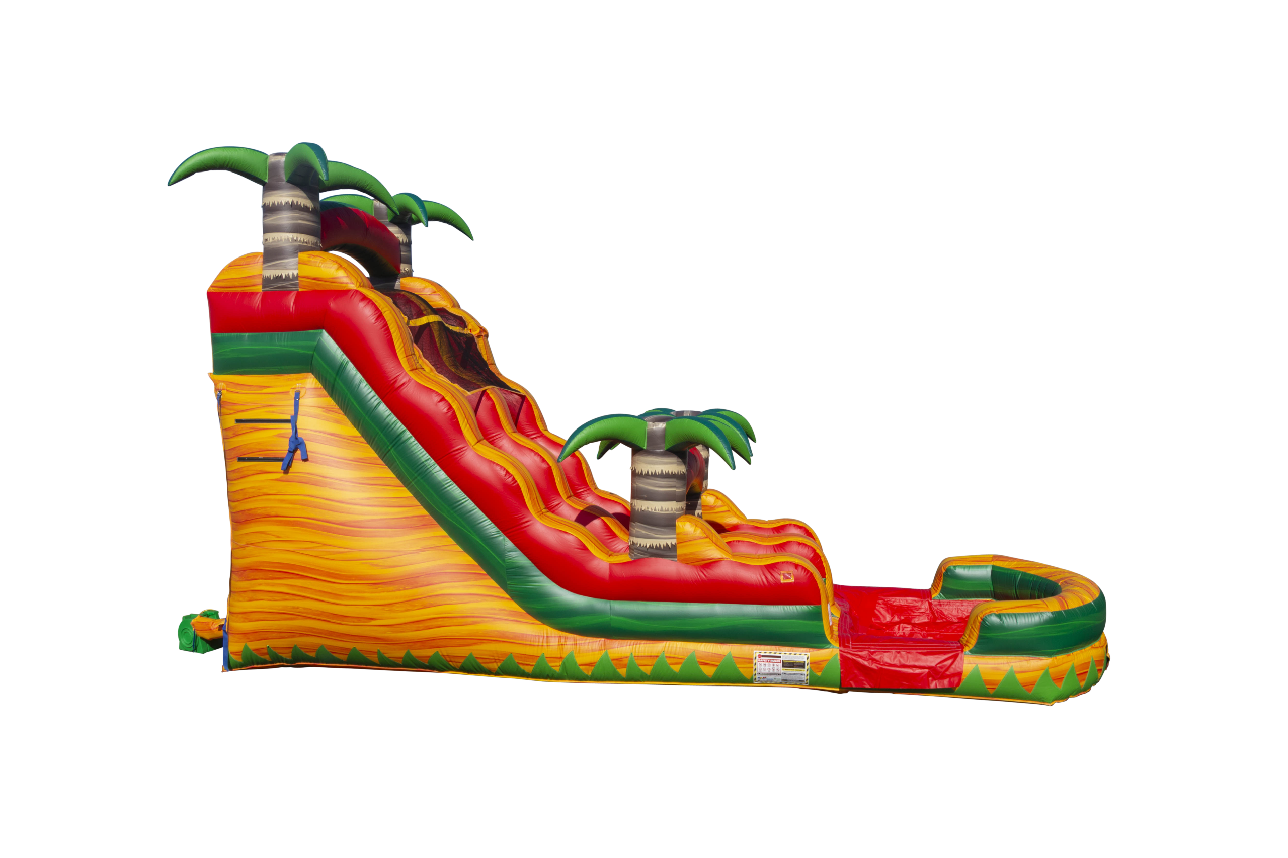 Our 18ft Fiesta Water Slide Perfect for Luaus or Tropical themed parties! Make your way to the top where the rainbow shines brightly between the palm trees then plunge down into the pool of water!